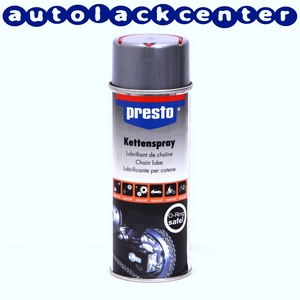 Presto Kettenspray sorgt durch die einzigartige Zusammensetzung für langanhaltende Schmierung von allen kettenbetriebenen Beförderungsmittel und Anlagen. Das Schmiermittel ist sehr stark haftend, wodurch es außerordentlich geeignet für schnell laufende und schwer belastete Ketten, wie die von (Cross) Motoren ist. Zudem ist es dilatant eingestellt (umgekehrt thixotrop), wodurch ein Ablaufen des Öles von der Kette auch bei schneller Bewegung verhindert wird.